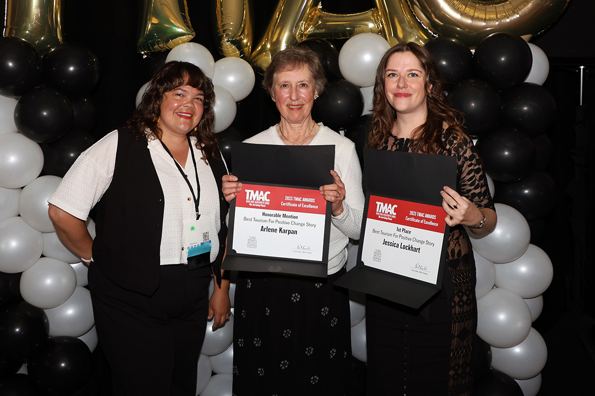Shown here is Arlene accepting Hon. Mention for the Best Tourism for Positive Change Story